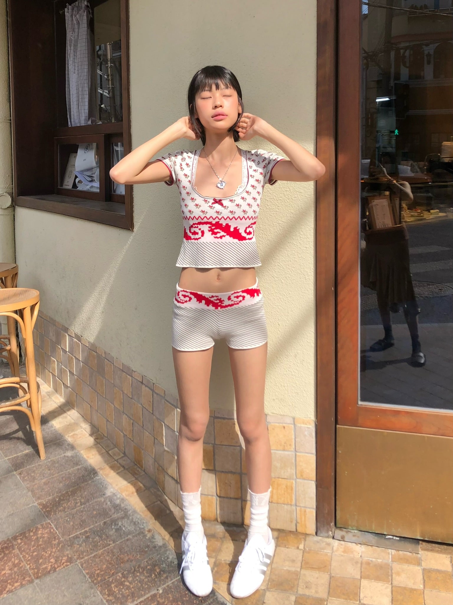 Red floral summer knit set - top + shorts