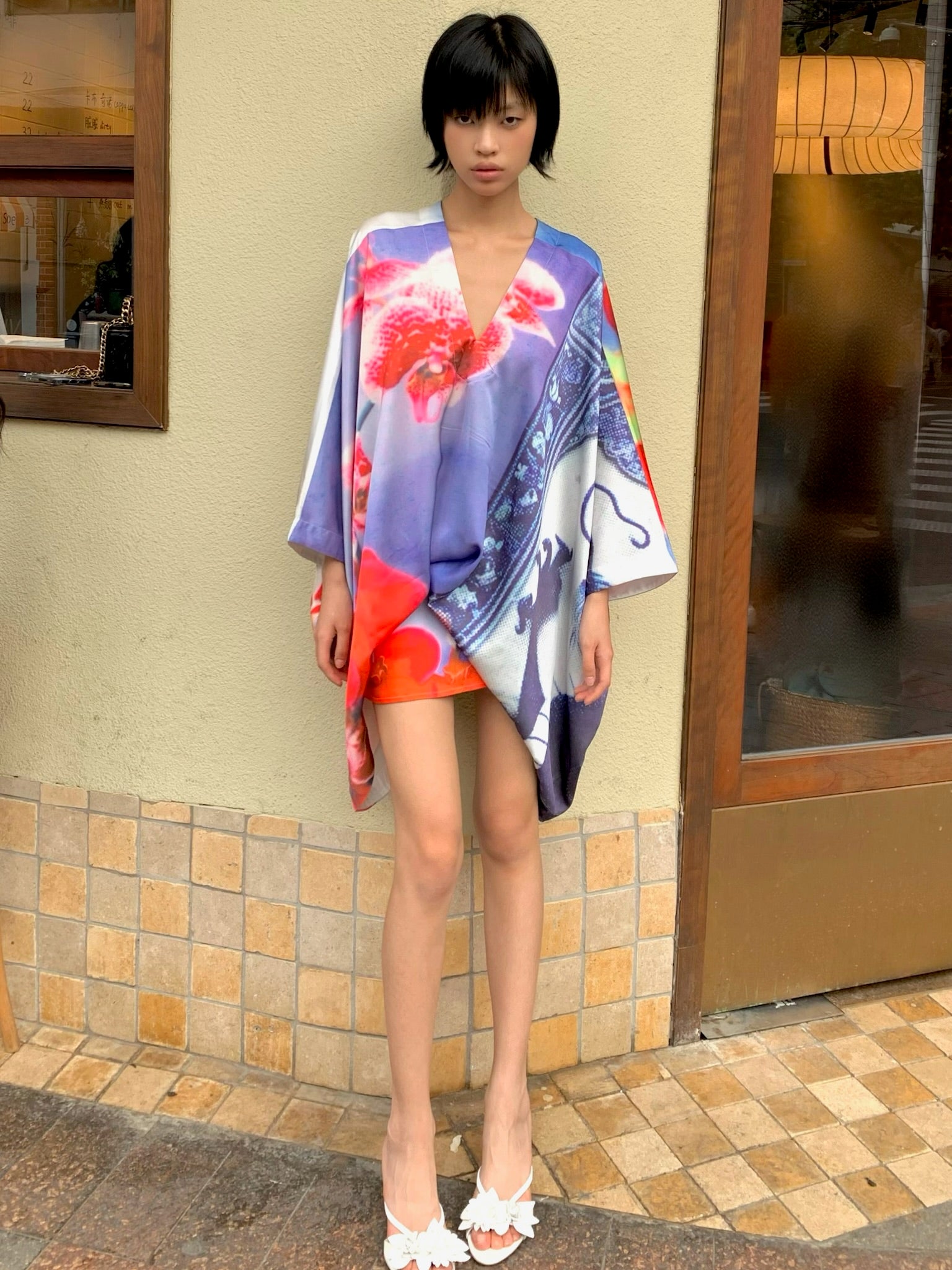 Orchid kimono - Embroidered satin wide sleeves cardigan (with belt)+Top+Skirt
